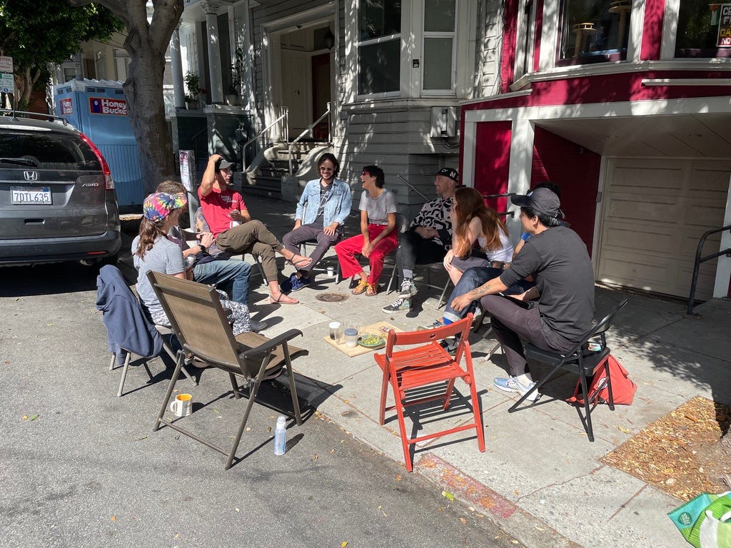 Tyler and I were already having leisurely weekend morning coffees in our house, so it was an easy pivot to sit outside with our coffees and enjoy the sunshine. And thus our tradition began. Every weekend, we would bring our folding chairs out onto the street – we had to make do since our house doesn’t have a stoop – and enjoy our caffeine. As we saw people entering or exiting their homes, we'd enthusiastically wave them down, introduce ourselves, and write down their names in our shared spreadsheet. I wore a goofy tie-dyed Six Flags hat so people would remember us as “those people” and we started calling this our brand awareness campaign (but of course, we live in SF).
